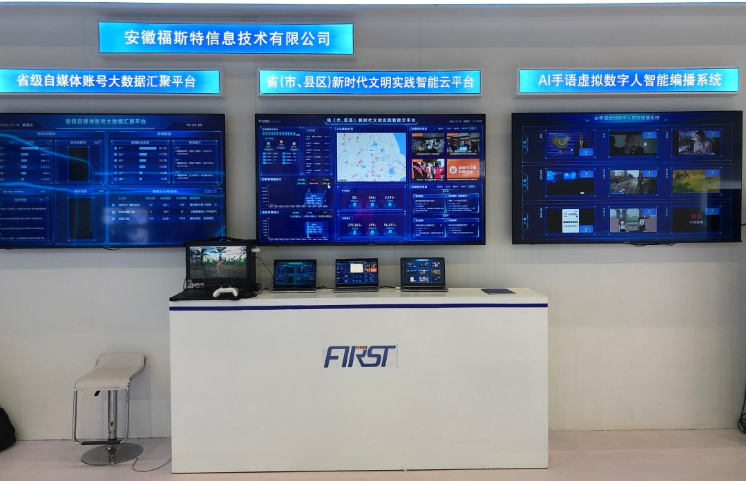 安徽福斯特信息技術(shù)有限公司此次應(yīng)邀參展,以廣電媒體發(fā)展為亮點(diǎn),集中展示大數(shù)據(jù)、人工智能,呈現(xiàn)了AI-VLOG視頻智能合成系統(tǒng)+AI手語虛擬數(shù)字人智能編播系統(tǒng)+省級自媒體賬號大數(shù)據(jù)匯聚平臺+?。ㄊ小⒖h區(qū))新時代文明實(shí)踐智能云平臺技術(shù)。